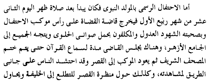 D’après عبد المنعم la célébration officielle avait l’habitude d’avoir lieu après la prière de midi, le lendemain du 12 du moi de rabi’ Al-awal, date de naissance de Mohamed. Le juge en chef sortait dans un cortège accompagné par les témoins recevables, qui était des hommes constituait une sorte de jury dans le système judiciaire de l’époque fatimide et qui avaient pour rôle de conseiller le juge et l’assister en tant que témoins des verdicts rendus…. Le juge en chef était donc accompagné de ses hommes plus des personnes qui transportaient des plateaux de sucrerie et de gâteaux jusqu’à la mosquée d’Al-Azhar où ils restaient écouter la lecture entière du Coran avant de se diriger vers le château du Khalifa suivi par la foule qui espérait apercevoir le khalife.